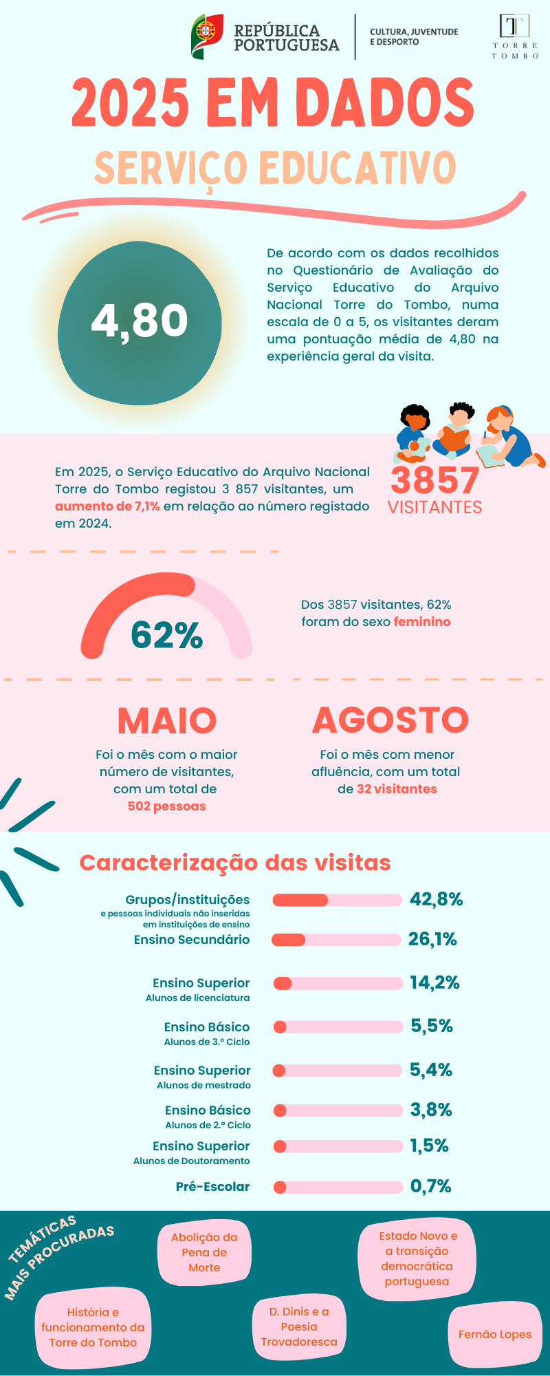 Em 2025, o Serviço Educativo do Arquivo Nacional Torre do Tombo (ANTT) registou resultados muito expressivos, mantendo o seu foco em consolidar o seu papel enquanto espaço de aprendizagem, investigação e valorização do património documental. As atividades desenvolvidas ao longo do ano demonstraram um crescimento da procura por parte de grupos e participantes individuais, evidenciando o interesse crescente da comunidade escolar, académica e do restante público. Ao longo do ano, foram realizadas 161 visitas orientadas, com a participação de 3857 visitantes, que resulta de um trabalho consistente de divulgação e articulação com diferentes entidades, nomeadamente universidades, academias seniores e escolas.